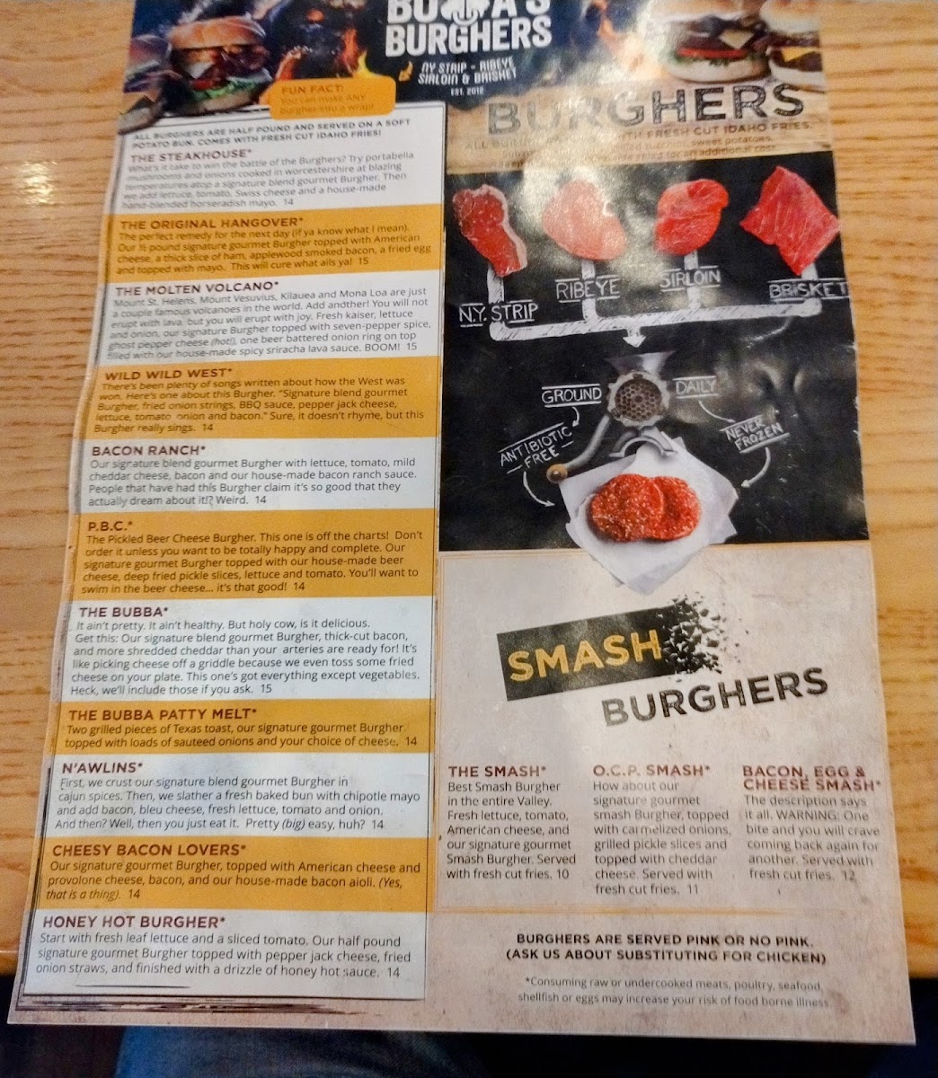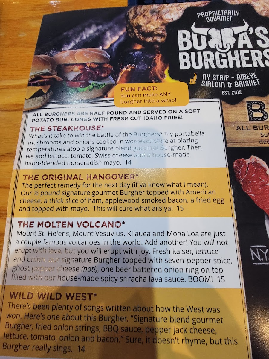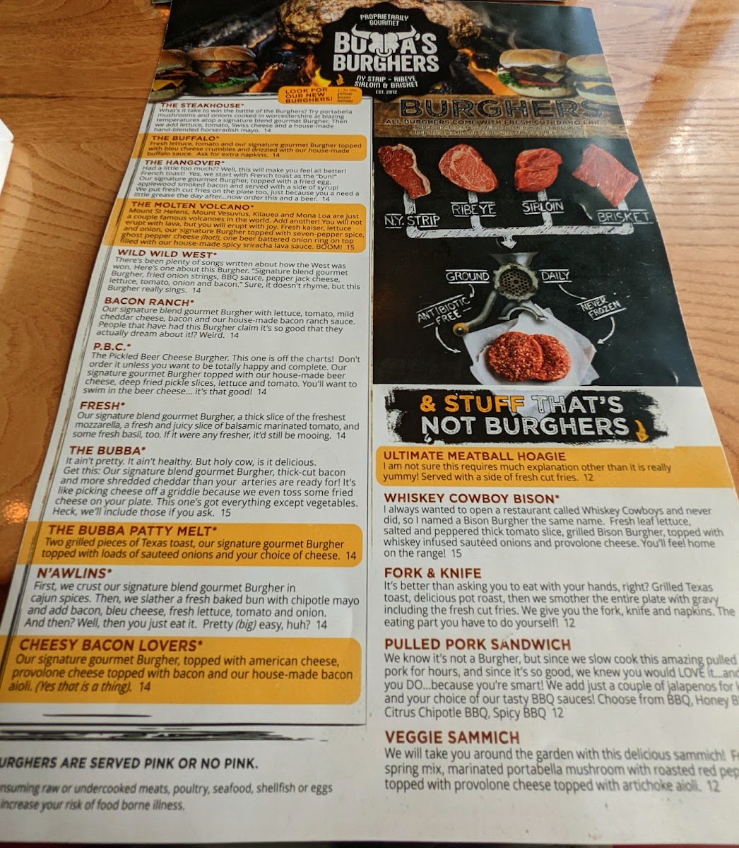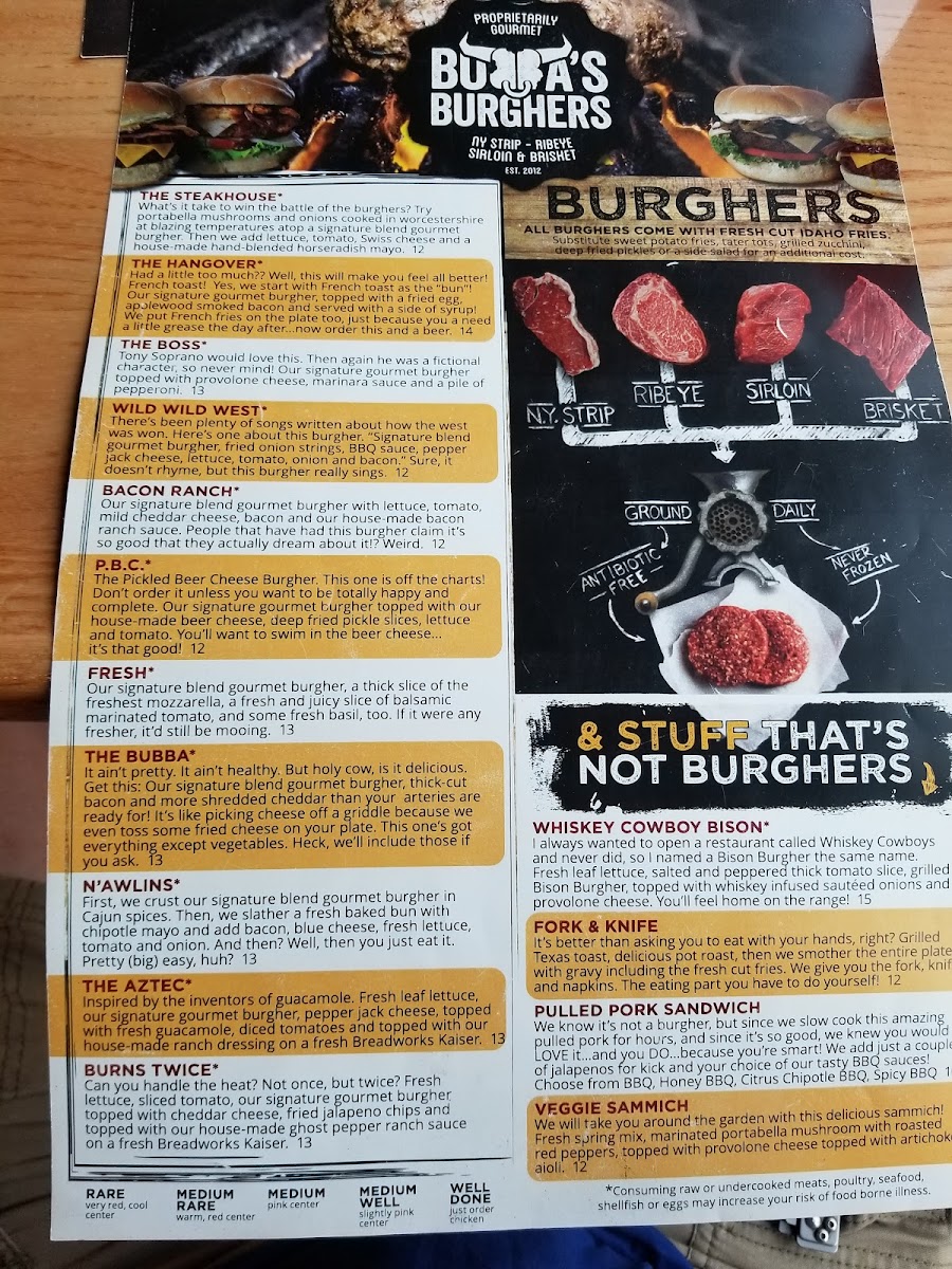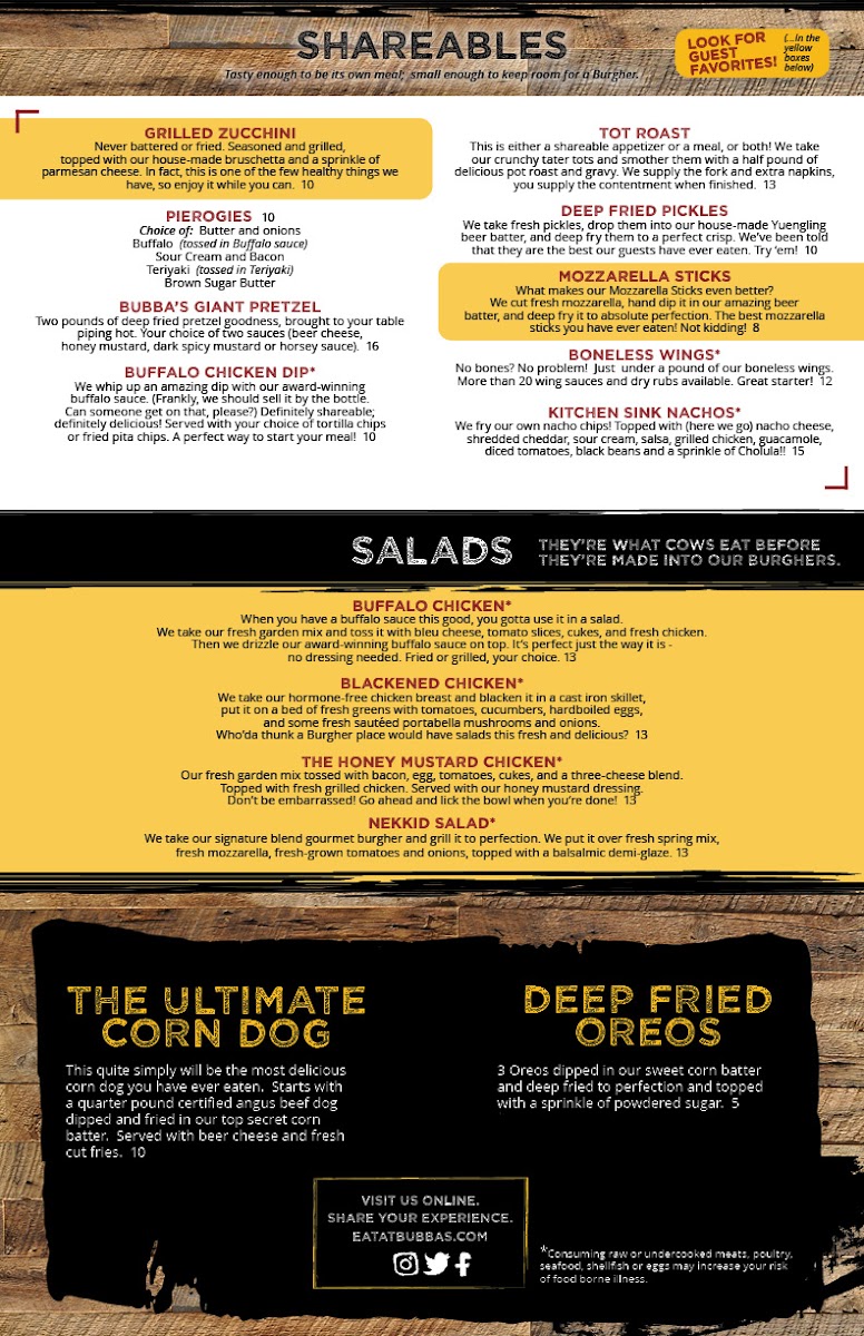 Welcome to Bubba's Gourmet Burghers & Beer At The Highlands Menu, where bold flavors meet a laid-back vibe in Triadelphia, WV. Whether you're craving a juicy, handcrafted burger or a cold pint of craft beer, Bubba's has something to satisfy every craving. The menu boasts a variety of gourmet burghers piled high with fresh, mouthwatering ingredients, each bite bursting with flavor. And don't forget the sides! From crispy fries to signature dips, there's a perfect pairing for every meal. With a welcoming atmosphere, it’s the ideal spot to unwind, enjoy great food, and sip on a cold one with friends.